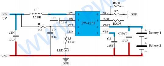 PW4253的典型应用电路极为简洁。核心外围元件包括输入/输出电容、功率电感以及用于设置电流的电阻。其IADJ引脚内置2.6KΩ电阻,悬空时默认充电电流为1.14A。如需更大电流,可外接电阻RADJ,阻值与目标恒流值(ICC)的关系为:RADJ (KΩ) = 3/(ICC - 1.14)。例如,欲设定ICC为2A,则RADJ约为3.49KΩ。
