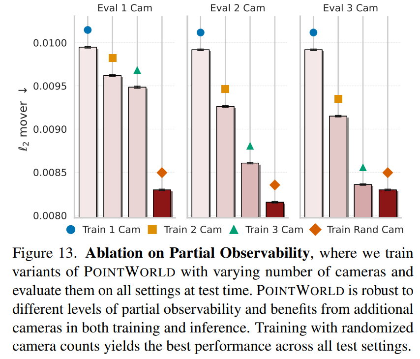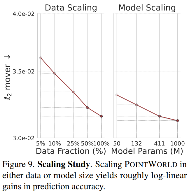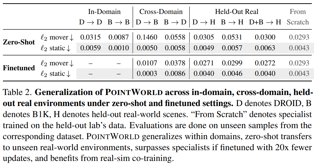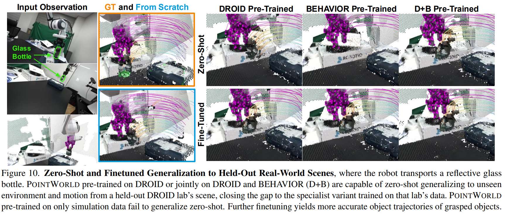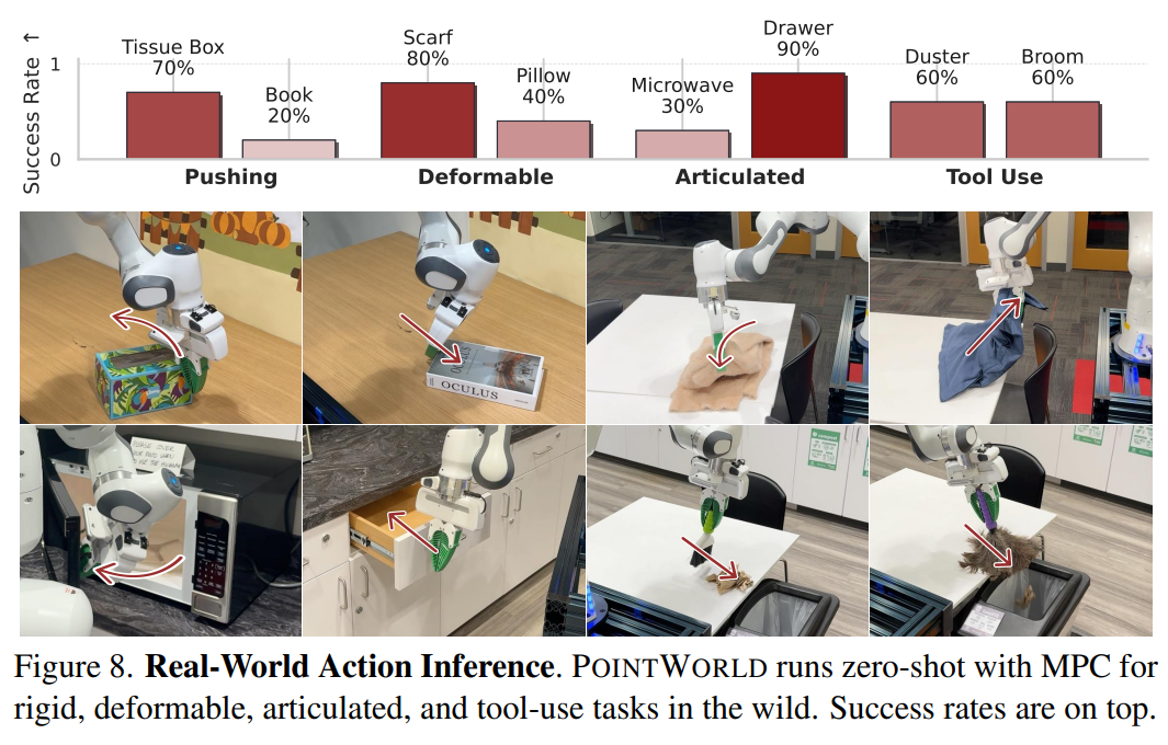 PointWorld 通过 "模型性能 - 泛化能力 - 真实部署" 的三级验证体系,充分证明其技术有效性: