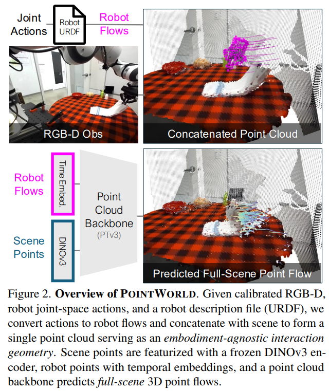 统一表征设计:状态以 RGB-D 重建的全场景 3D 点云表示,动作通过机器人 URDF 模型生成 3D 点流轨迹,二者在同一 3D 空间中建模物理交互;