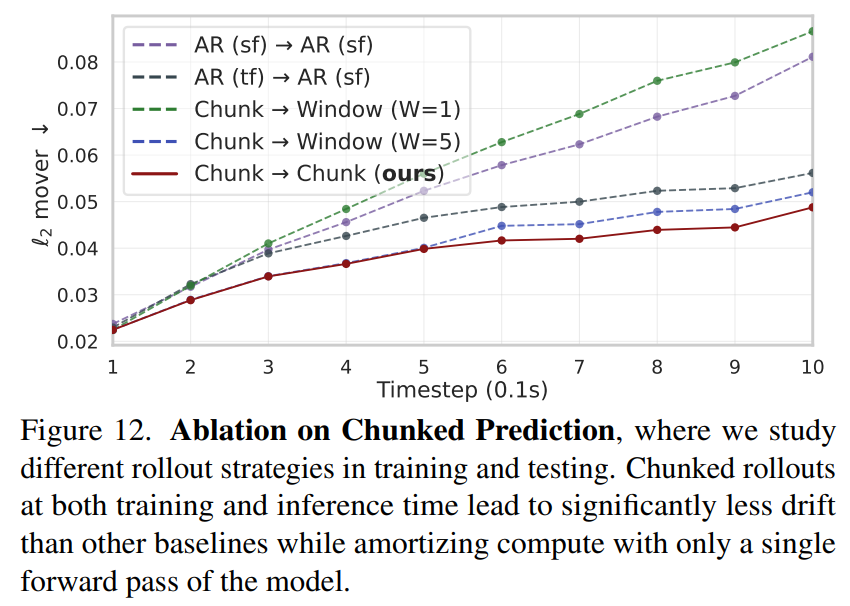 稳定训练机制:引入运动加权损失聚焦动态点学习,结合不确定性正则化与 Huber 损失提升噪声鲁棒性,采用 10 步块预测策略减少推理漂移;