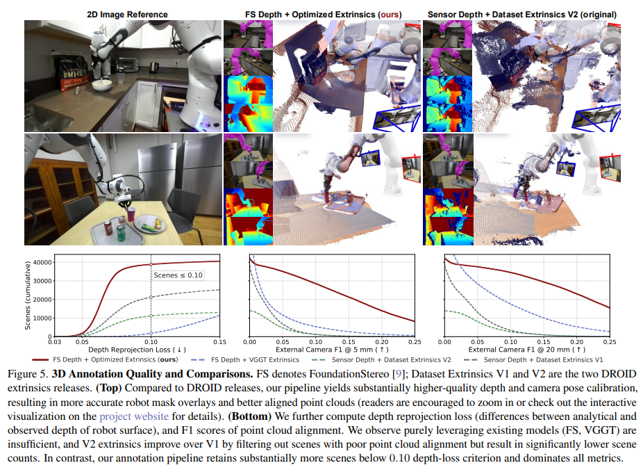 高精度 3D 标注流水线:结合 FoundationStereo 深度估计、VGGT 相机姿态优化与 CoTracker3 点追踪技术,解决野生环境下深度噪声与相机校准问题,将轨迹误差控制在 1.8cm、旋转误差 1.9 度以内;
