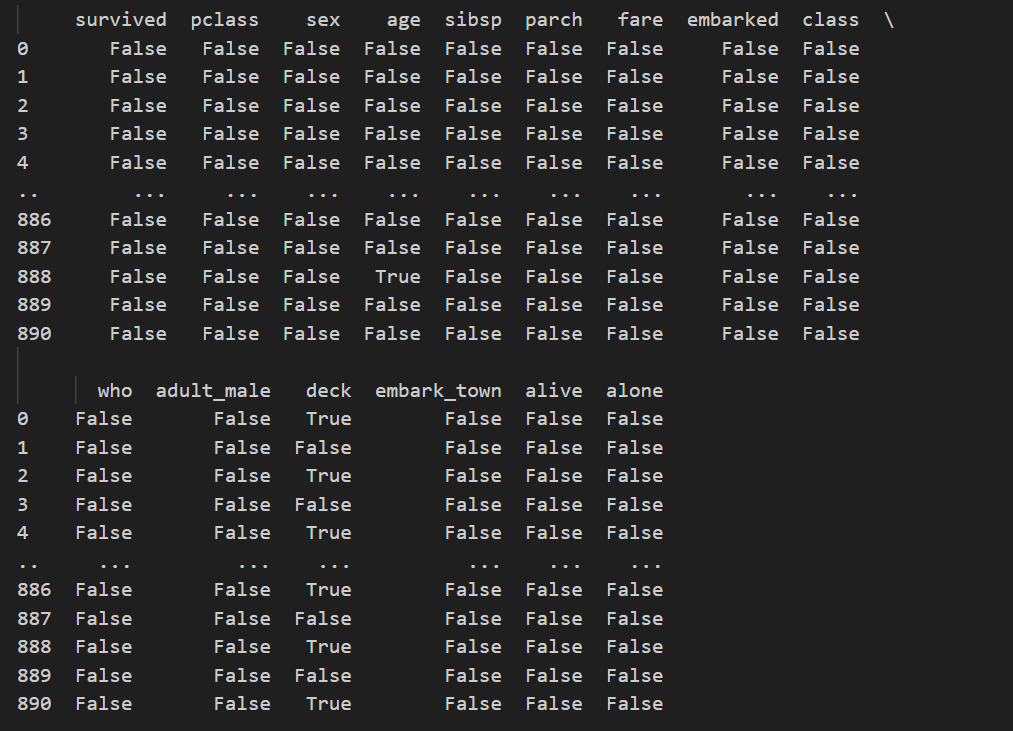print(df.isnull()) # 显示每个元素是否为缺失值