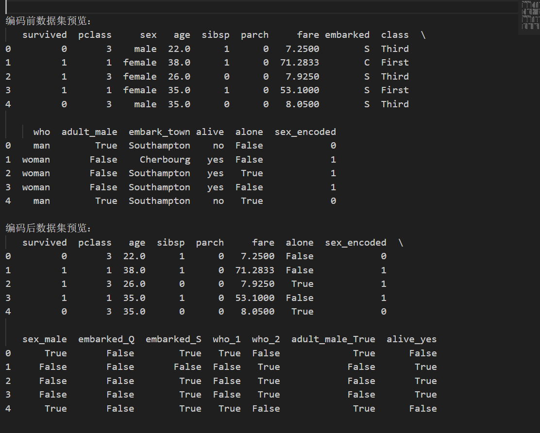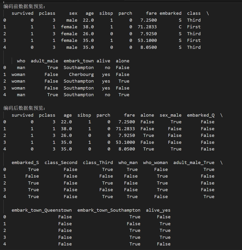 通过编码前后的对比,我们发现独热编码多出来很多列,这与独热编码的特性有关,比如embarked就分为了两列(原因是embarked有Q、S、C三个取值,用bool需要两列才能完全表示)