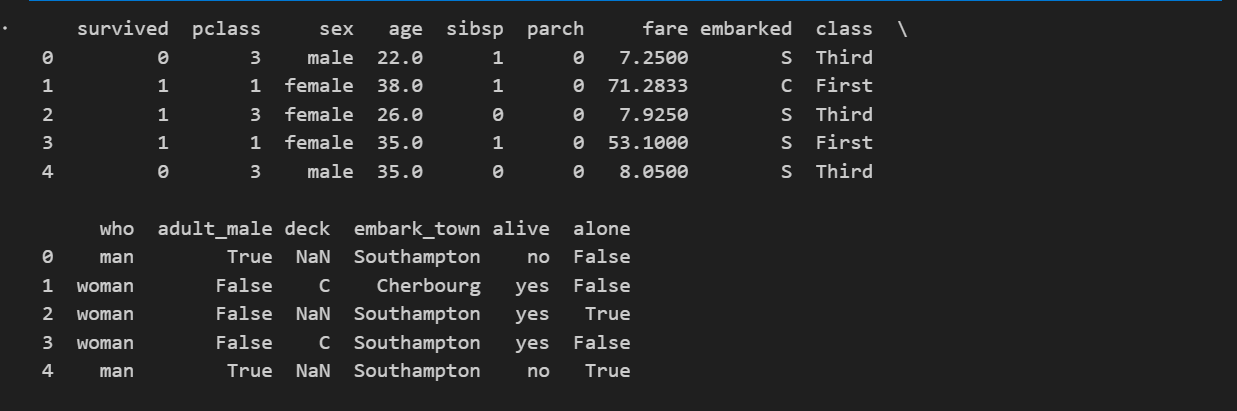 df = pd.get_dummies(df, columns=['sex', 'embarked', 'who', 'adult_male', 'alive'], drop_first=True)