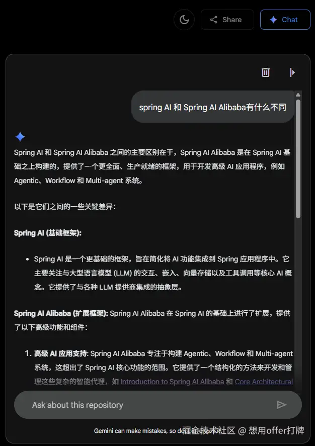 在右侧还有Gemini可以来进行提问,非常方便,实测挺好用的。而且回答都是基于当前生成的最新的文档,不需要担心知识库的滞后性问题