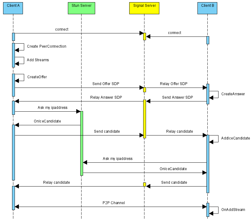 如图展示了WebRTC点对点通信的完整流程,包含客户端、STUN服务器和信令服务器的协同工作。通过SDP交换和ICE候选者发现,系统能够在复杂的网络环境下建立稳定的视频连接。