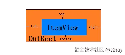 所以其实 outRect 是 itemView 外面的一个框,类似一个相框,把 itemView 围了起来,其实就类似于给当前 itemView 外面添加了 margin,如下图所示: