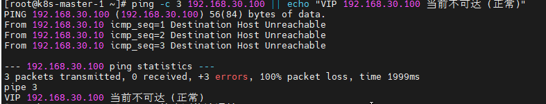 ping -c 3 192.168.30.100 || echo "VIP 192.168.30.100 当前不可达 (正常)"