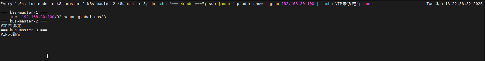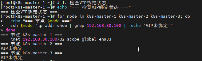 watch -n 1 'for node in k8s-master-1 k8s-master-2 k8s-master-3; do echo "=== $node ==="; ssh $node "ip addr show | grep 192.168.30.100 || echo VIP未绑定"; done'