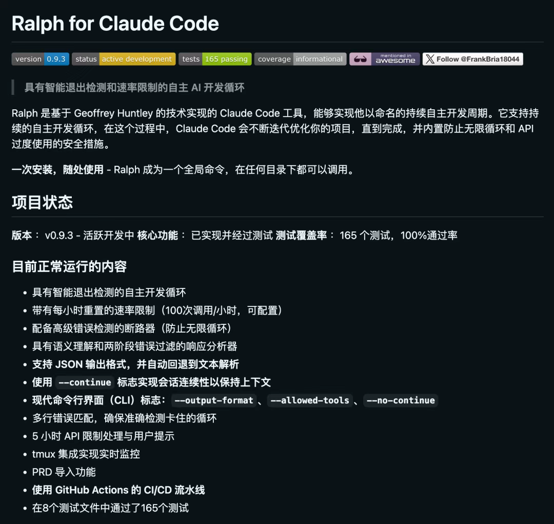 核心亮点:Ralph 是一个围绕 Claude 构建的高级 CLI 工具。它不是简单的问答,而是能够理解你的本地文件系统,在终端里直接执行代码重构、文件分析等任务,是极客开发者必备的"命令行副驾驶"。