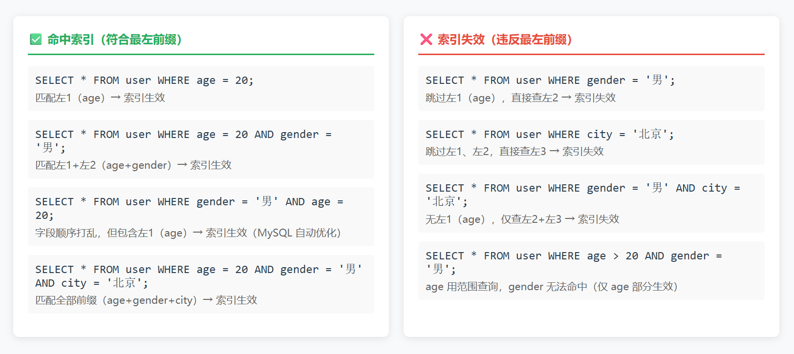 -- 最左前缀原则:能命中索引的查询是 age / age+gender,仅查 gender 则不命中