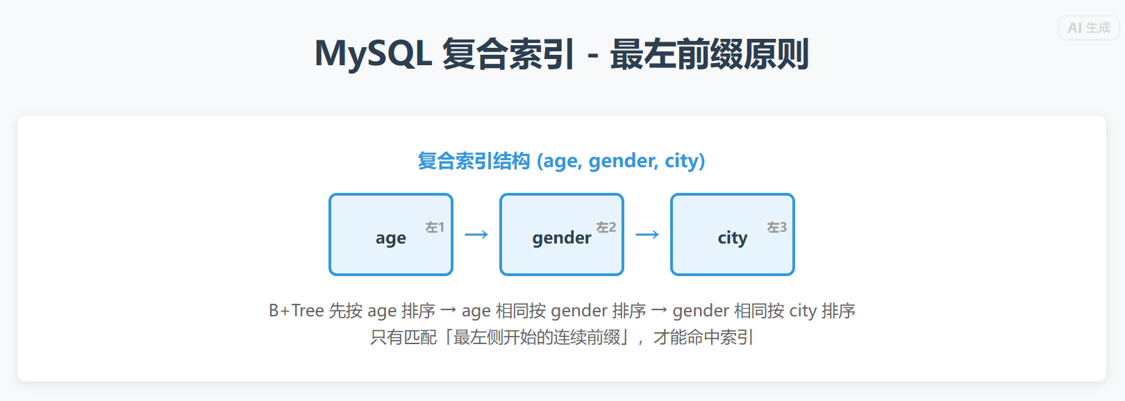 当你创建复合索引 (比如 idx_age_gender(age, gender))时,MySQL 会优先匹配索引中最左侧的字段,然后依次向右匹配 ------ 只有查询条件包含 "最左前缀",才能命中该复合索引;跳过左侧字段直接查右侧字段,索引会失效。
