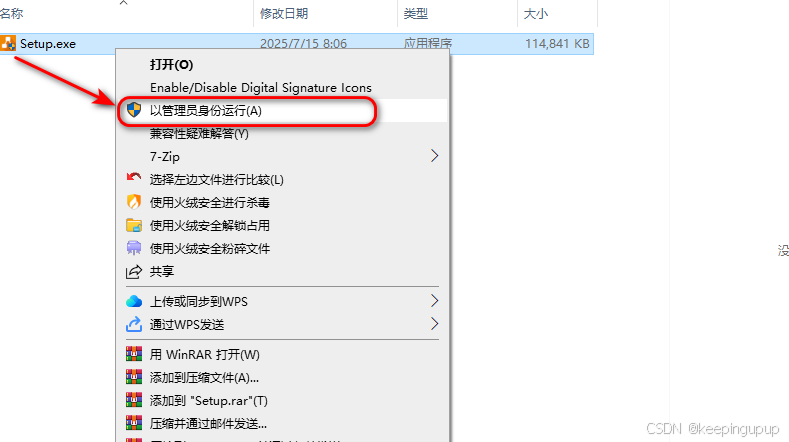 找到 Setup.exe 安装文件,右键选择"以管理员身份运行"