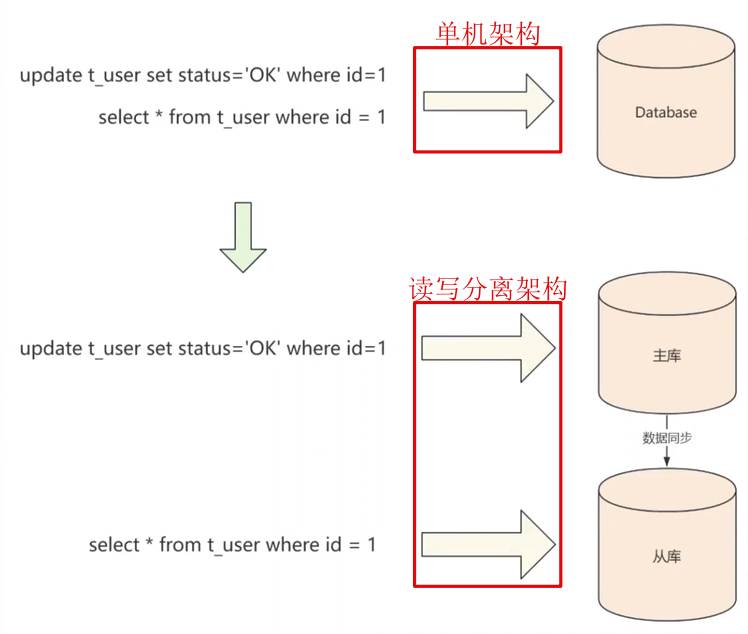 - 单机架构 与读写分离架构 的区别演示