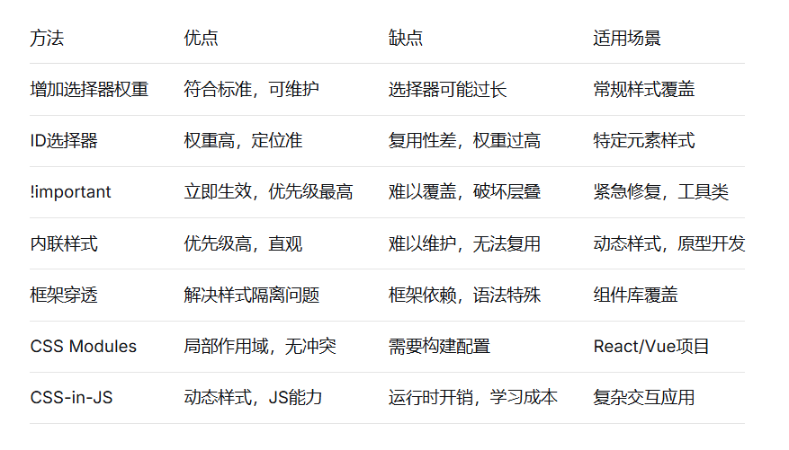 核心原则:尽量通过良好的CSS架构和命名规范来避免优先级冲突,而不是依赖权重竞争。当确实需要提升优先级时,选择对代码可维护性影响最小的方法,并记录相关决策原因。
