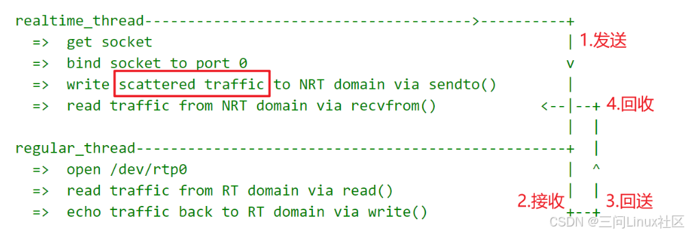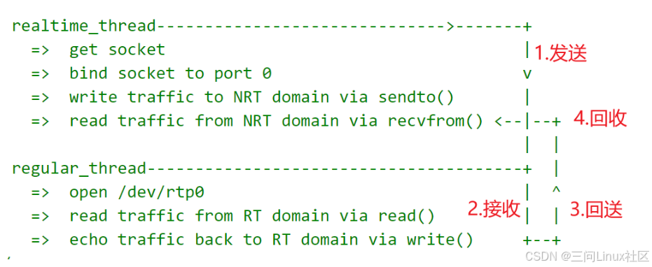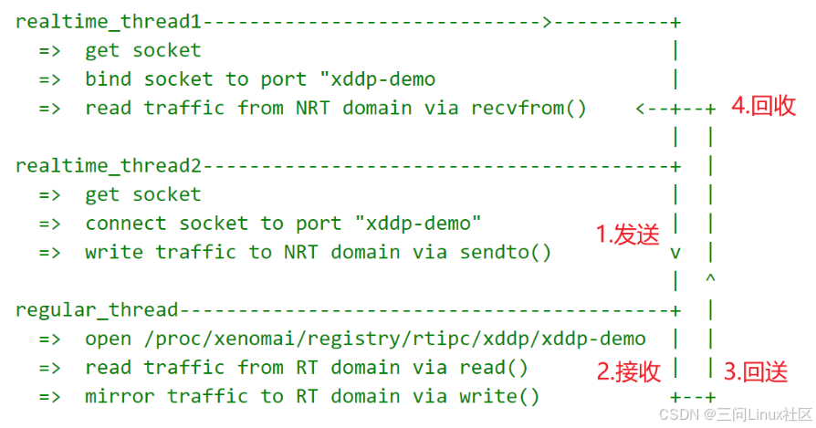 本程序演示了Xenomai实时线程与Linux常规线程通过XDDP协议进行双向通信的过程。实时线程通过XDDP套接字发送数据,常规线程通过字符设备文件先读后写,实现数据回显功能。如下图所示,共经历发送、接收、回送、回收共 4 个步骤。