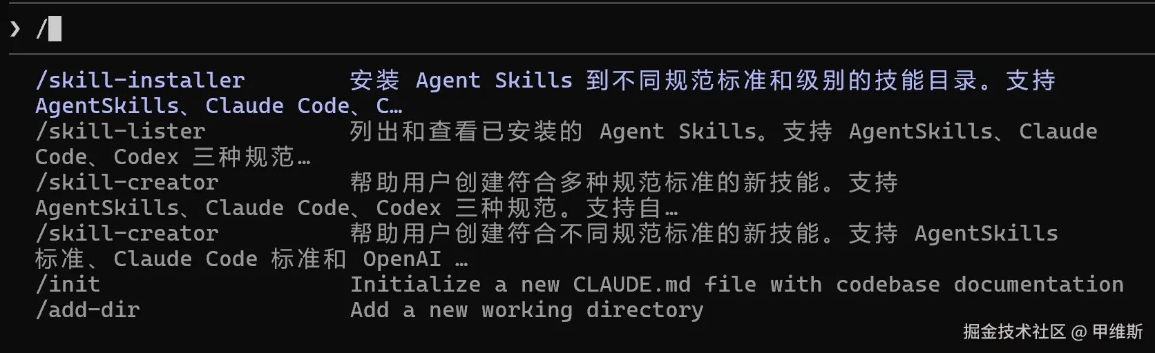 我之所以有这个想法是因为,我记得 Codex 提供了官方的技能管理技能。而 Claude Code 好像只有一个查看技能的技能。