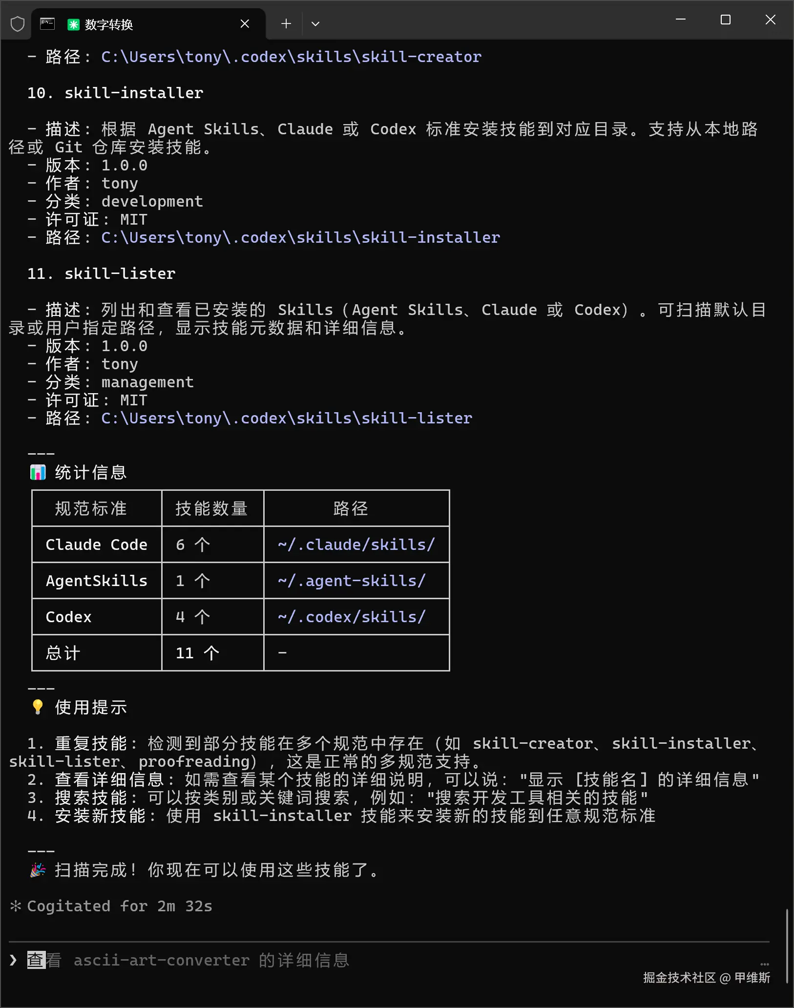 它会自动查找所有技能目录,列出所有技能。列表会 自动进行分类。最后有一个汇总的统计信息。