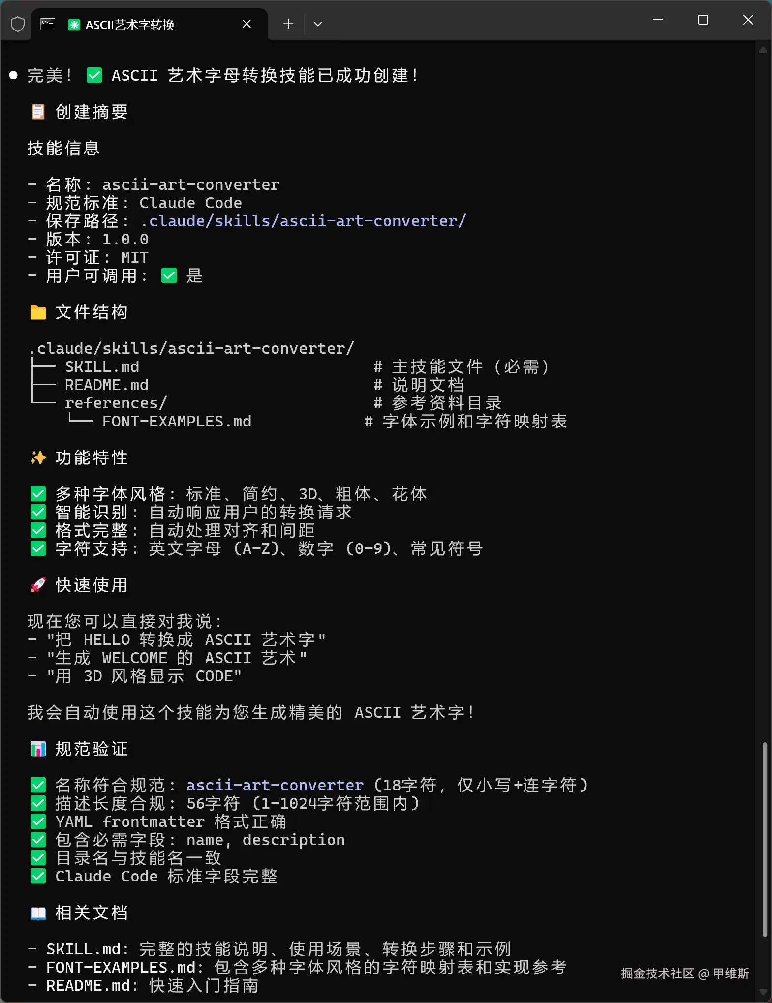 现在重启下 Claude Code 就能看到 /ascii-art-converter 技能了。