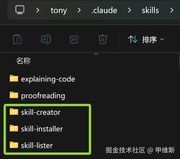 在用户目录下的 .claude/skills 里面应该有三个 skill 开头的技能。