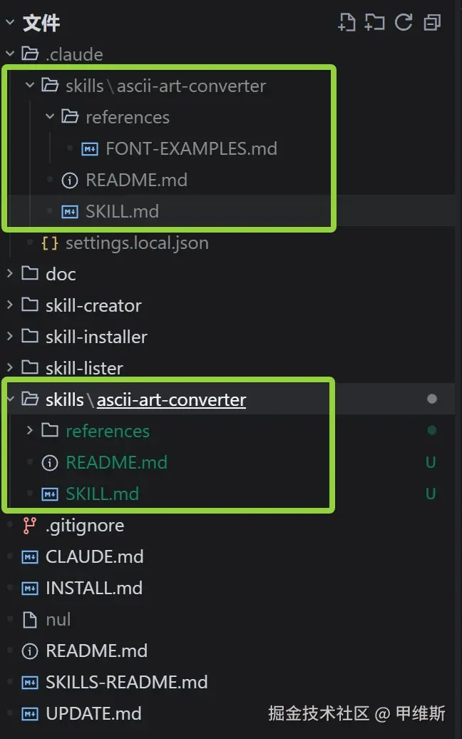 我的本意是希望他先把技能开发好,放在skills文件夹下面,下方的绿色框里的文件夹。
