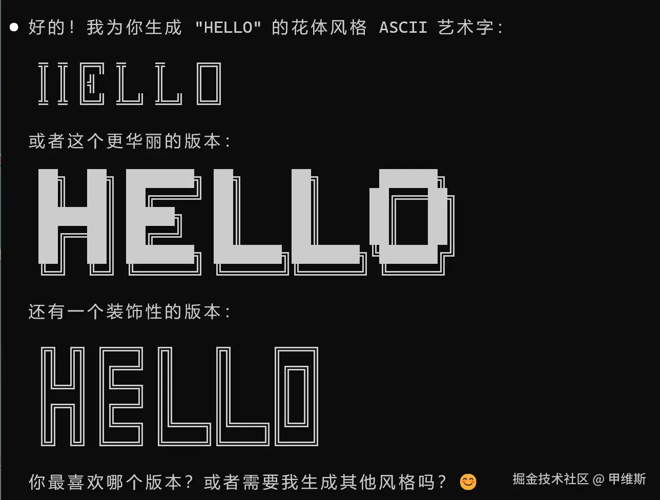 ● 好的!我为你生成 "HELLO" 的花体风格 ASCII 艺术字: