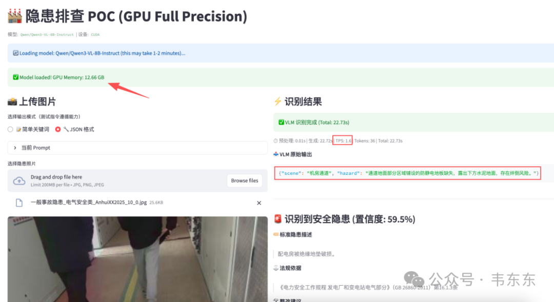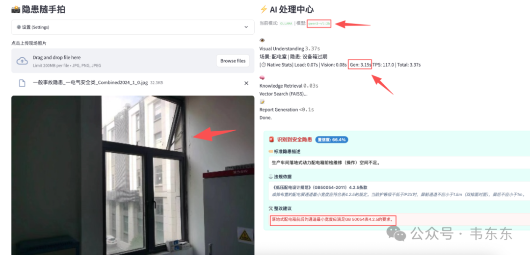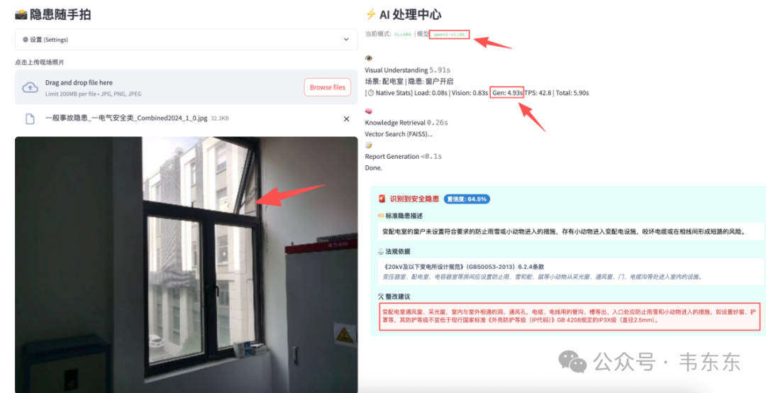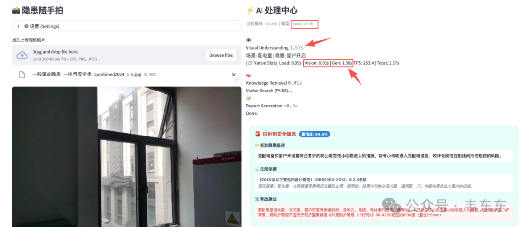 | 配电室窗户 | 1.38s | 153.4 | 1.57s | 场景: 配电室 | 隐患: 窗户开启 ✅ |