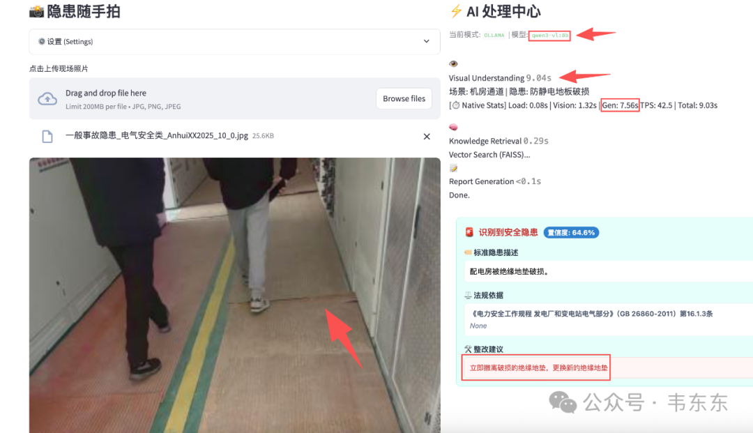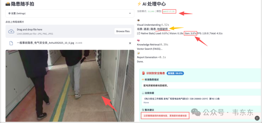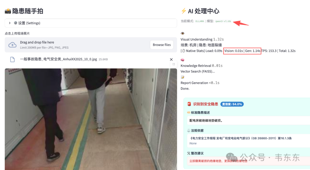 | qwen3-vl:2b | 场景: 通道 | 隐患: 地面破损 | 3.07s | 4.51s | ✓ 匹配到绝缘地垫破损条目 |