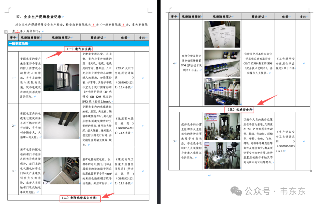 这个项目做 poc 拿到的就是第三种。对方提供了几份 Word 格式的《企业生产现场检查记录》,记录了巡检人员在现场发现的各类隐患。文档本身的结构看似规整:标准的表格、清晰的列定义(序号/隐患描述/现场照片/整改建议/法规依据),但实际上手解析才发现坑不少。