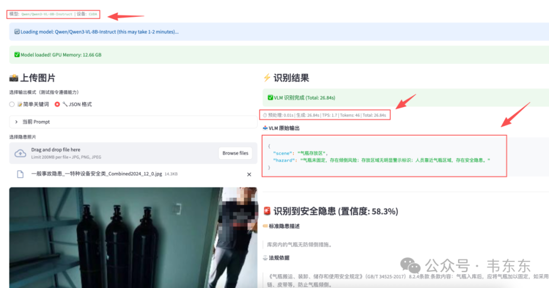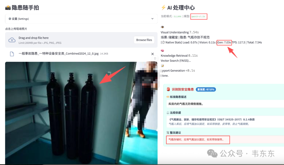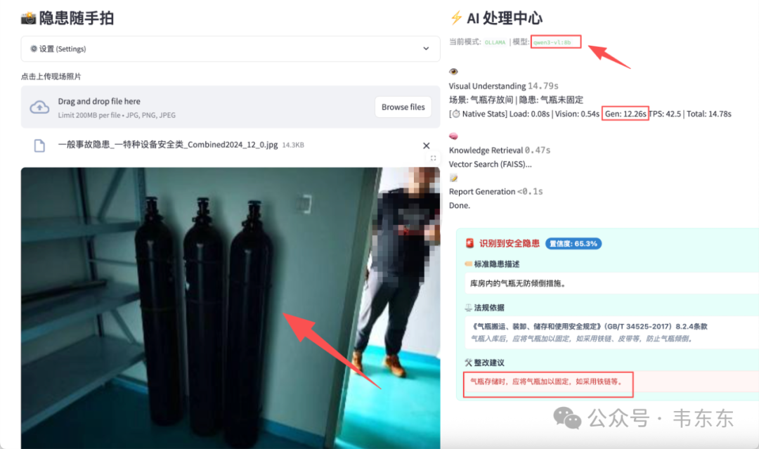 | 气瓶存放 | 1.88s | 153.3 | 2.13s | 场景: 气瓶存放区 | 隐患: 气瓶未固定 ✅ |