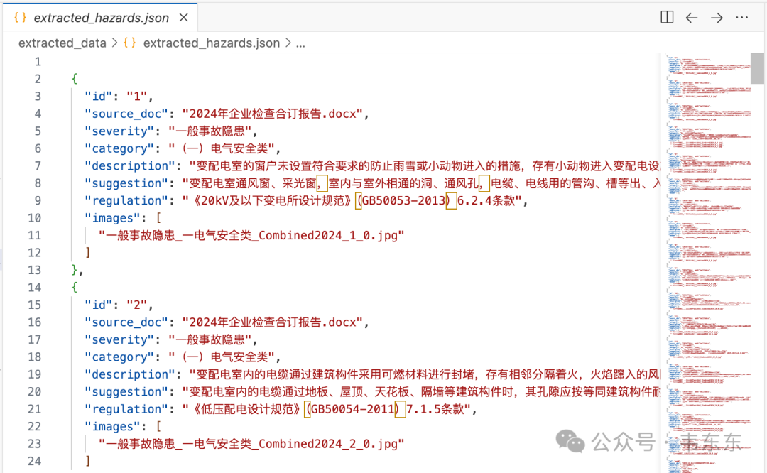 JSON 的结构则是为后续知识库构建服务的。每条隐患记录包含:
