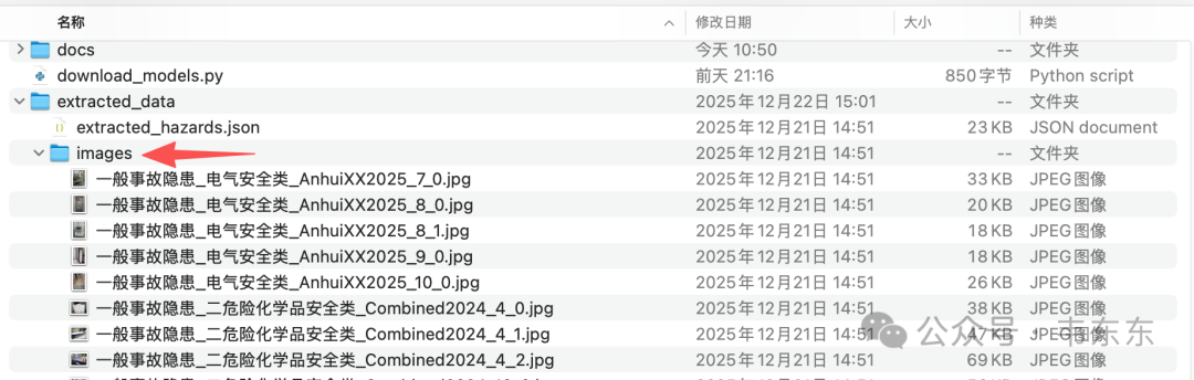 图片的命名采用语义化策略:{严重程度}{隐患分类}{来源文档脱敏标识}{隐患 ID}{索引}.jpg。比如 一般事故隐患 _ 电气安全类 _AnhuiXX2025_1_0.jpg。这样设计的好处是,脱离 JSON 数据后,单看文件名也能快速判断这张图属于什么类型的隐患,方便人工抽检核查。