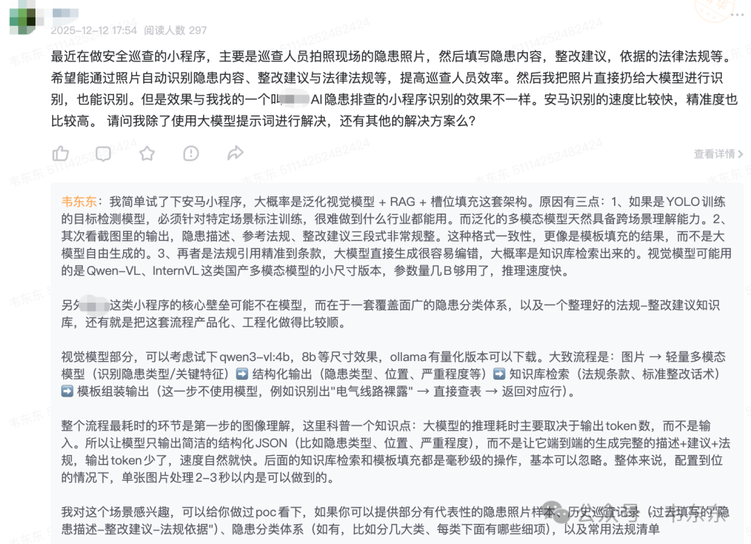 起因是半个月前知识星球里收到一个成员的提问。对方在开发安全巡查类的小程序,核心功能是巡查人员拍照现场隐患后,系统自动识别隐患内容、给出整改建议、并引用对应的法律法规。他已经封装了大模型 API 在后端做识别,Prompt 也调了很多版,但测试下来识别的效果和速度都达不到预期。但注意到市面上某款 AI 隐患排查小程序,速度快、精准度高,不知道人家是怎么做到的。