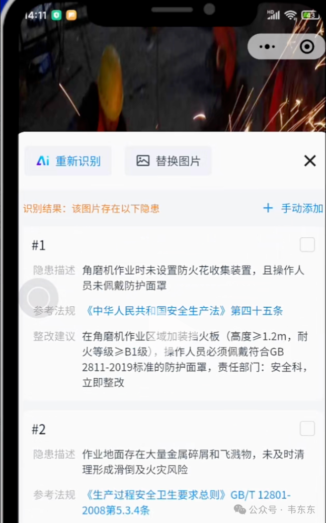 我搜了这个小程序试了下,给的判断是大概率不是靠纯 Prompt 或者 YOLO 目标检测,而是"轻量多模态模型 + 私有知识库 + 模板填充"的组合拳。从商业化的角度,这类应用的核心壁垒不在使用了什么特殊的大模型,而是一套覆盖面足够广的隐患分类体系,以及一个整理好的"法规条款-整改建议"知识库。