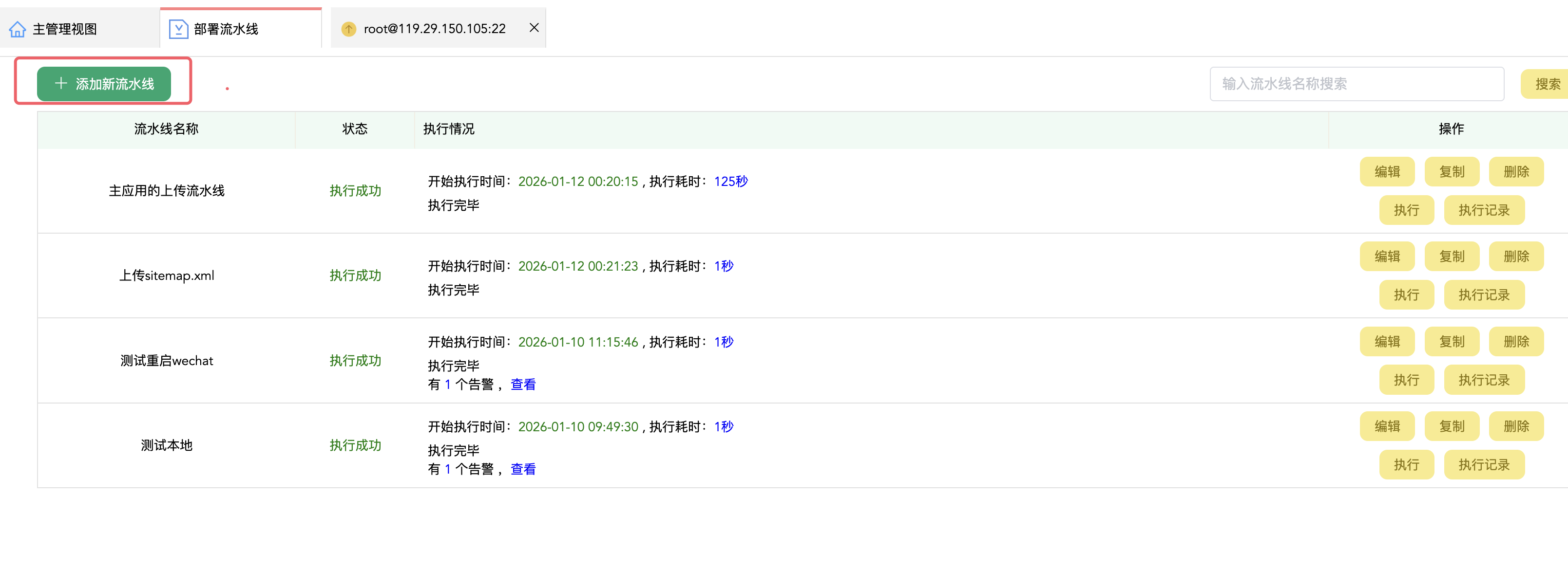 yunedit-ssh的特色在于它能在本地客户端定义流水线,由于他是ssh工具,有上传和执行远程命令的能力。因此,它的流水线不单能执行本地的脚本,还能执行上传文件、执行远程脚本。因此可以用来做发布的流水线。