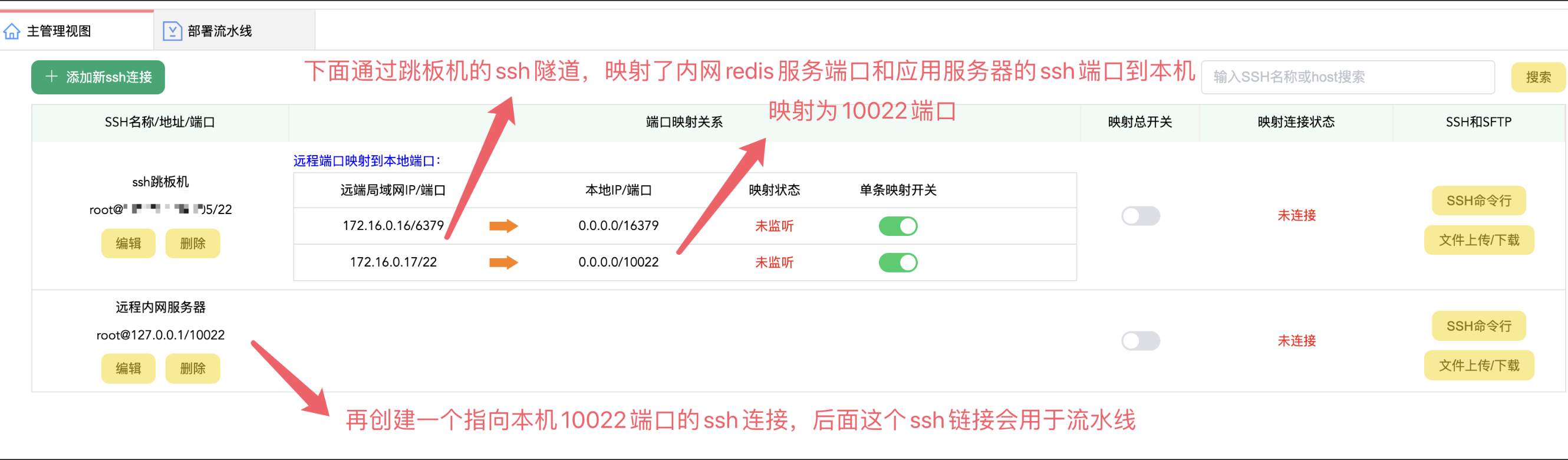 现在ssh管理里,创建ssh连接,下面例子是两个ssh连接,一个是外网ssh连接,一个是利用ssh隧道将内网ssh连接映射出来的例子: