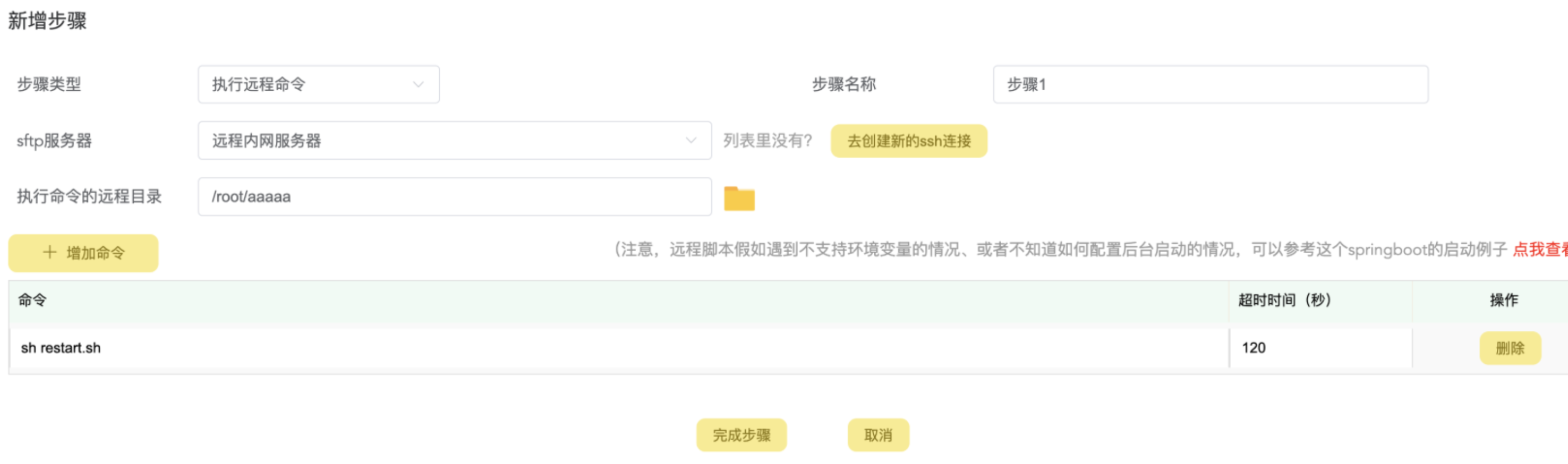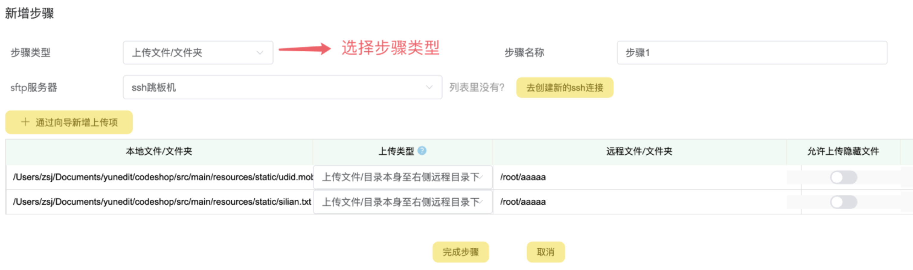 步骤里可以选择步骤的类型,比如是上传还是执行本地脚本,也可以执行远程脚本: