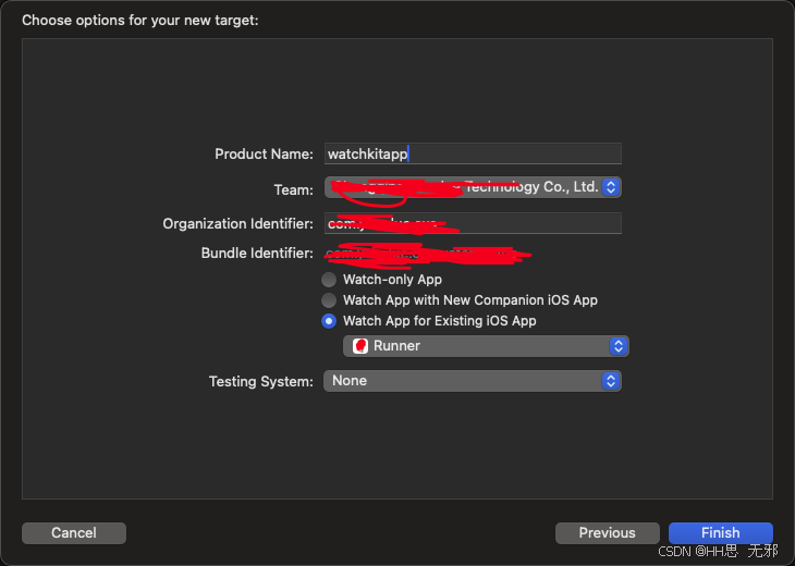 - Watch App Setup: 选 Watch App for Existing iOS App(这会把 Watch 和你现在的 iOS App 绑定)。