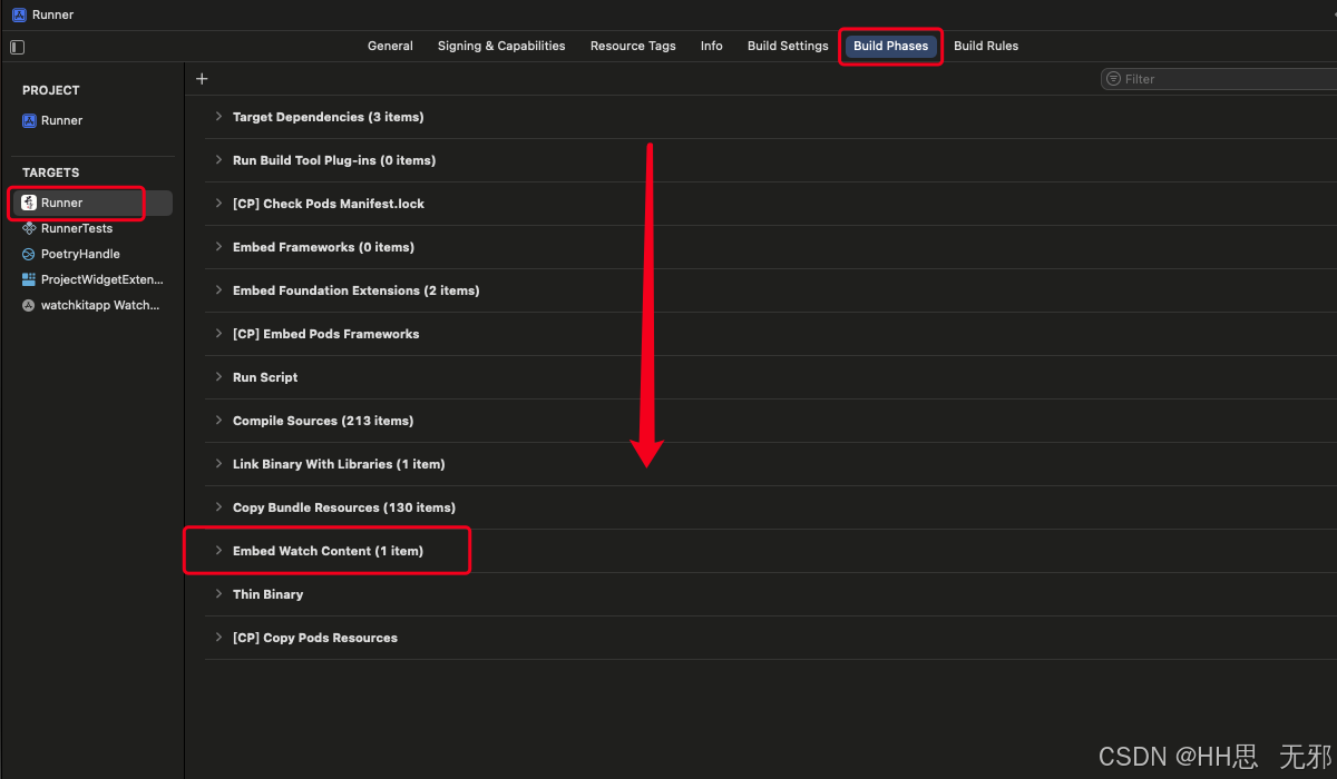 - 在右侧 TARGETS 列表中选择 Runner (注意是 iOS 的那个 target,不是 Watch 的)。