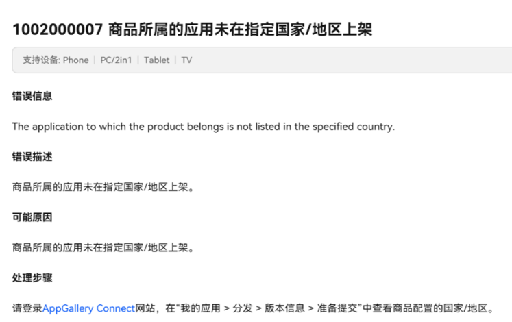 看意思是商品所属的应用未在指定地区开放,文档描述如下: