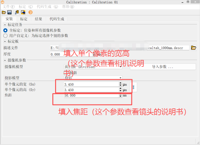(4)填入单个像素的宽高(看相机说明)和焦距(看镜头说明书)