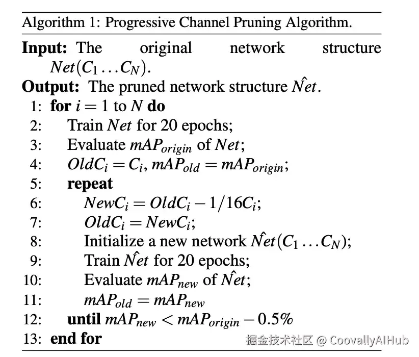 因此,研究者提出了一种渐进式剪枝方法来在修改后的网络中搜索"更薄"的架构。具体伪代码流程如下: