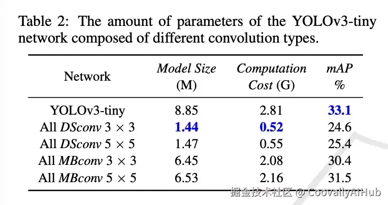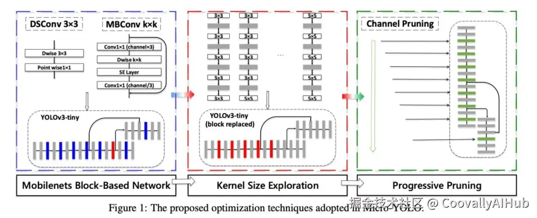 本文探讨了多种模型压缩方法,并提出了一种基于YOLOv3-tiny的改进型目标检测架构------Micro-YOLO。我们分析了几种类型的卷积层,例如深度可分离卷积(DSConv)和带有挤压激励模块的倒置瓶颈卷积(MBConv),以确定适用于Micro-YOLO网络的最佳层类型。同时,我们研究了这些卷积层中不同卷积核尺寸对Micro-YOLO性能的影响。