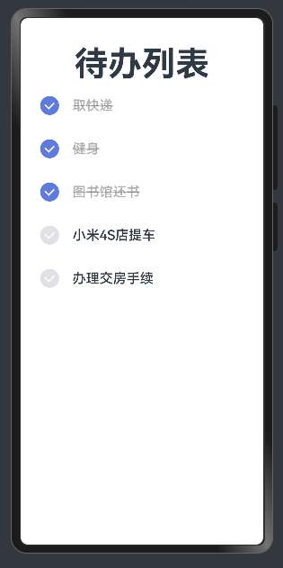 列出待办事项,前面有一个是否完成的图标标识当前事项是否已完成,如果已完成则为勾选状态切文字灰色展示带有删除线,如果为未完成状态,则为未勾选状态,文字是黑色显示无删除线