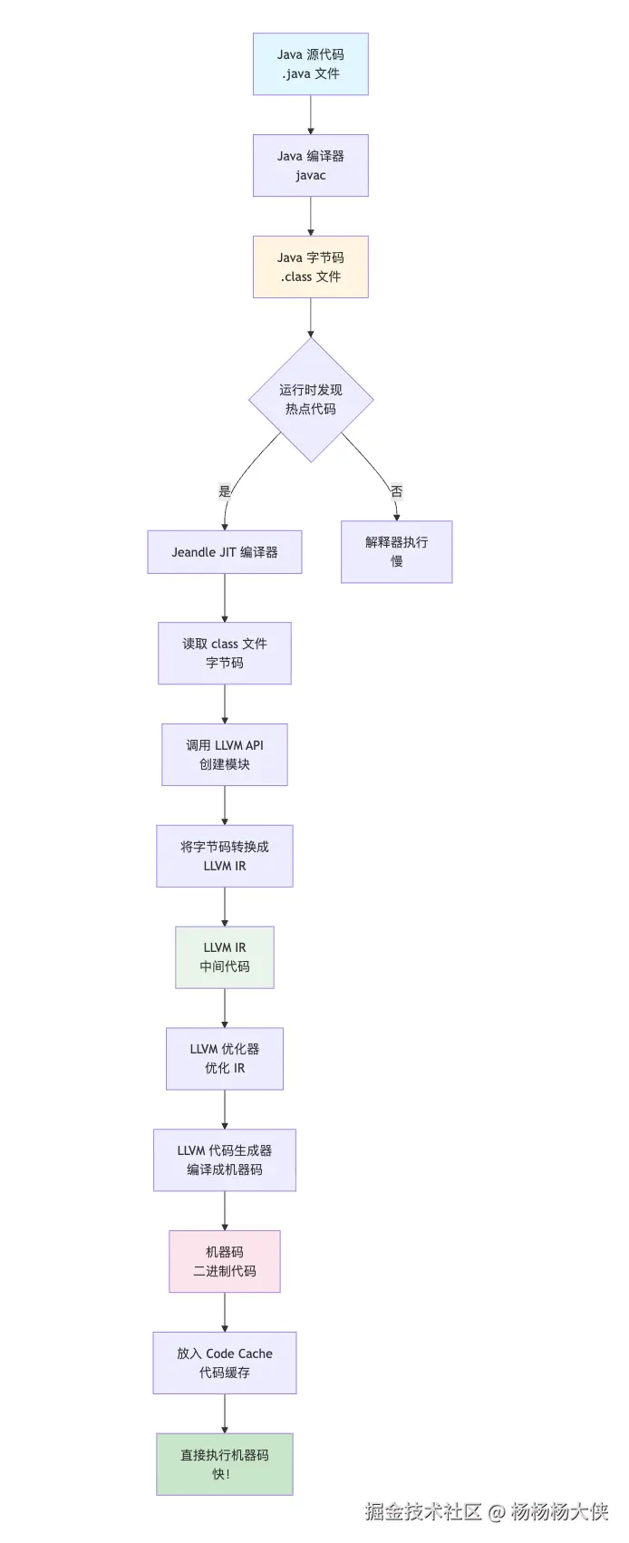 .class 文件] --> B{选择 JIT 编译器} B -->|传统方式| C[HotSpot C1/C2 编译器] B -->|新方式| D[Jeandle + LLVM] C --> E[直接生成机器码