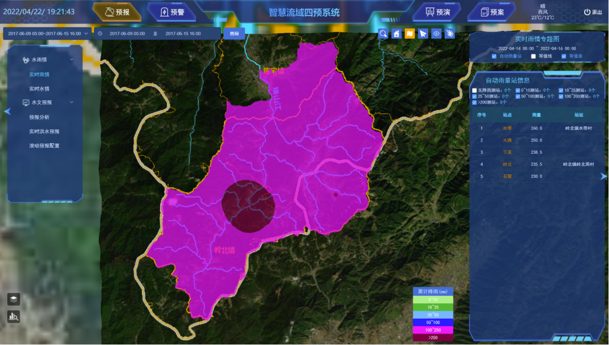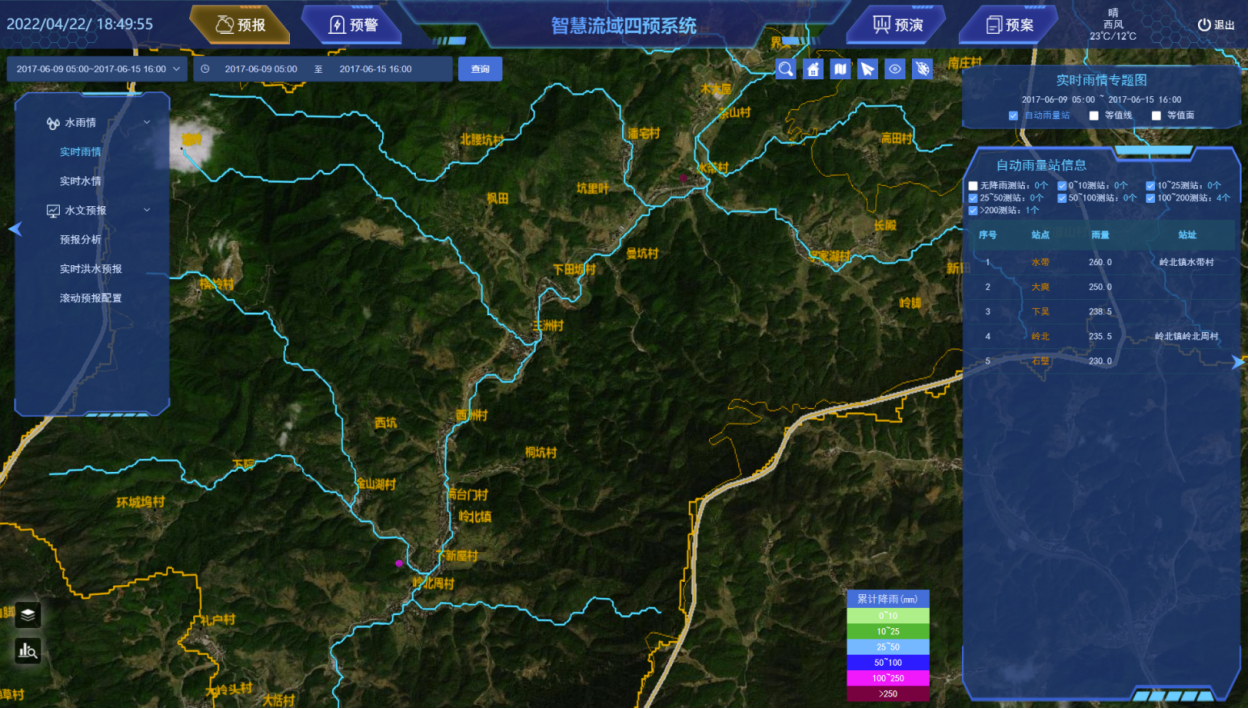 系统主要包括水雨情、预报分析、流量雨量预警、一维演进、其它辅助功能五大项。