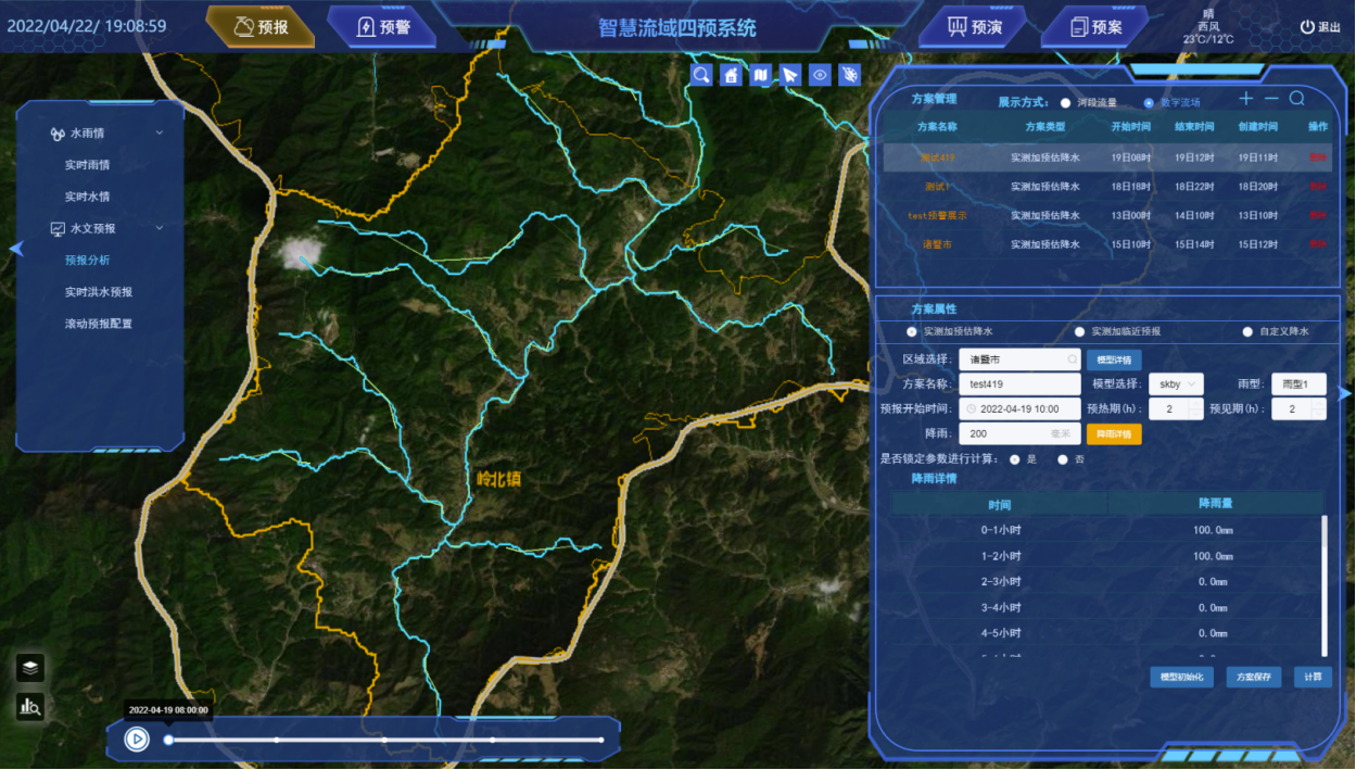 点击预报分析,分为实测加预估降水、实测加临近预报和自定义降水三种方式。在实测加预估降水模块下,点击创建方案填写对应的参数进行计算。结果以地图、表格形式展示汇集所有预报信息情况,提供预报信息的查询。