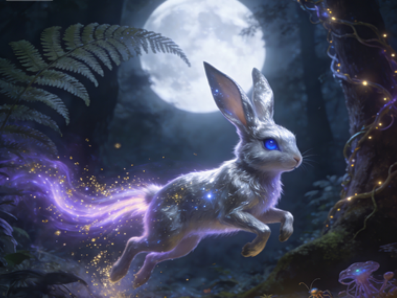 一只兔子在月光下的森林里跳跃,身后拖着一条会发光的尾巴。