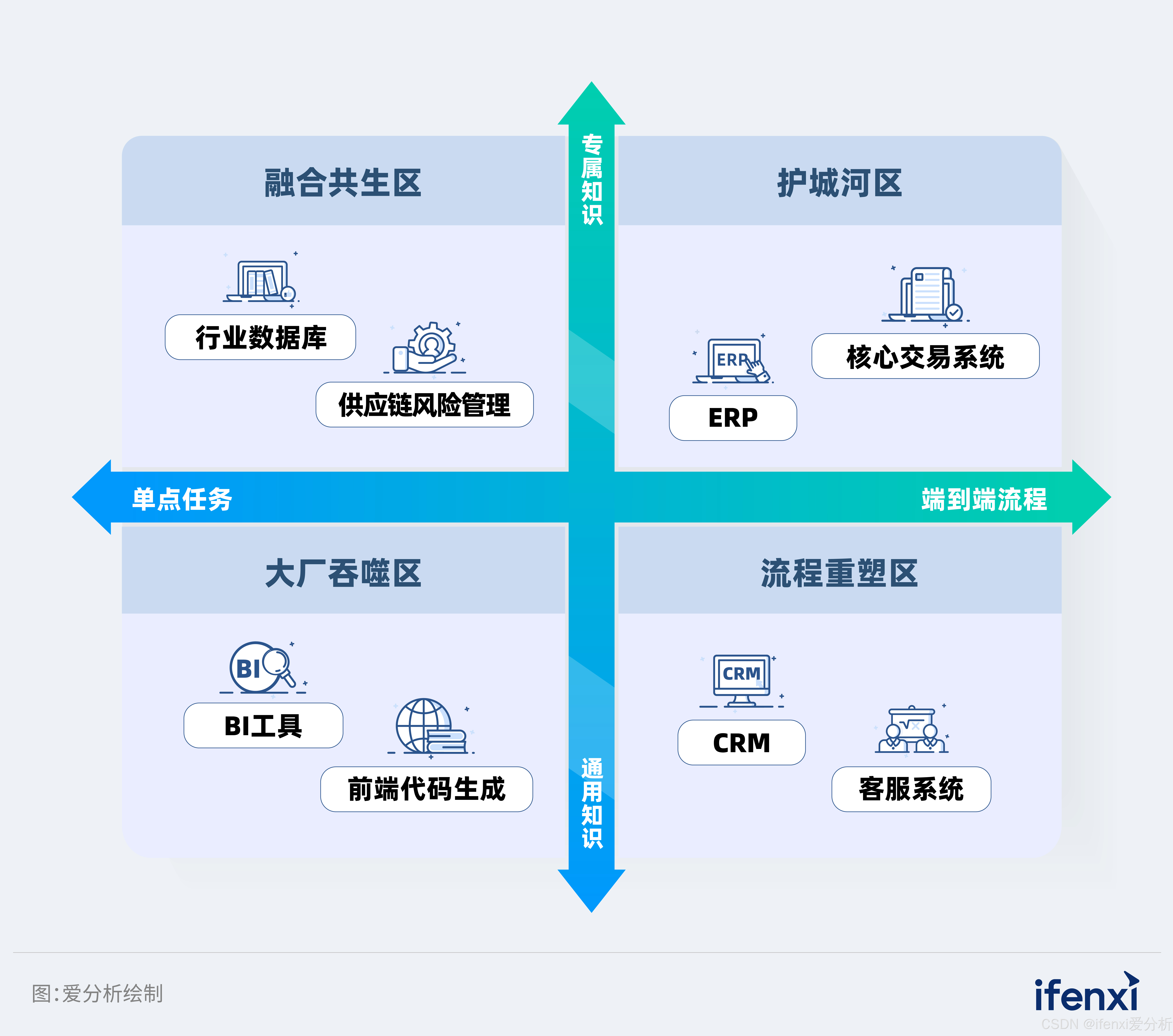 然而,当视角移向坐标轴的高处,即涉及隐性知识与业务机理的深水区时,情况则截然不同。隐性知识往往存在于行业专家的经验中,或是隐藏在业务机理之后。这些专属知识是应用厂商深厚的护城河。