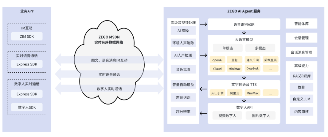 而ZEGO Express SDK的核心价值,正是解决"实时语音传输"的技术难题------提供跨平台、低延迟的推拉流能力,同时针对AI Agent场景优化了音频处理(如回声消除、噪声抑制),让语音交互更自然。